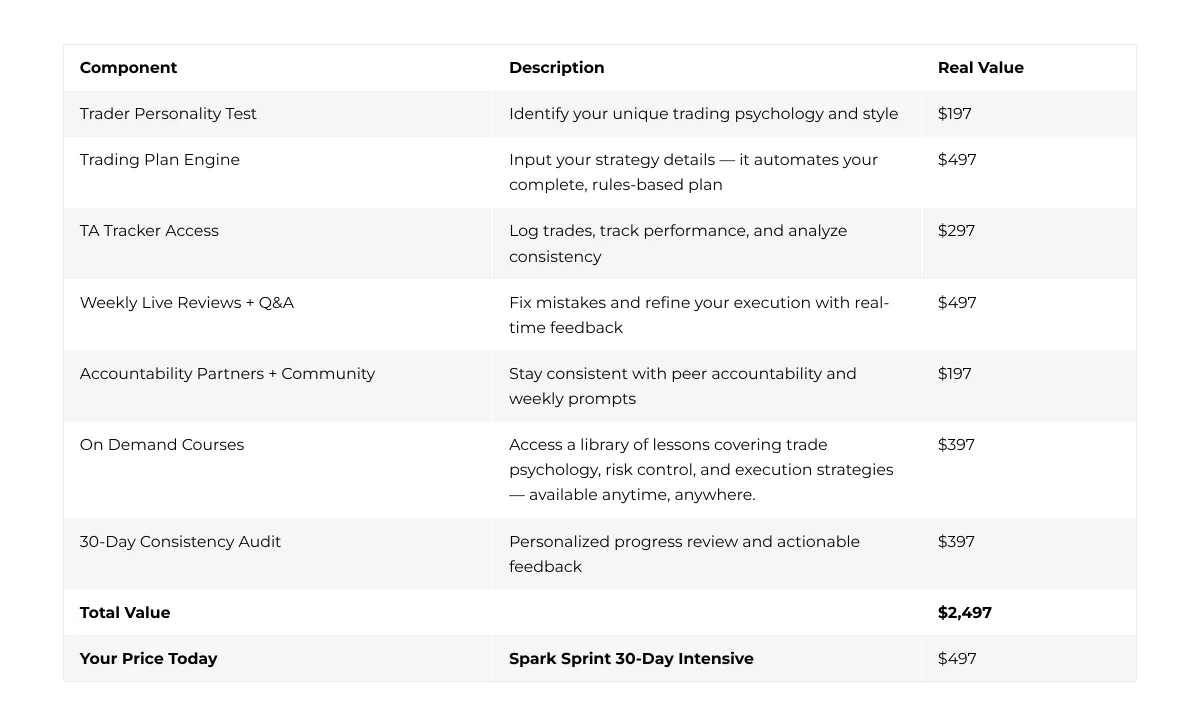 Great question. Most programs teach random strategies with no accountability. The Spark Program is built around your trader personality, a custom trade plan, and accountability milestones. This isn’t a “one-size-fits-all” approach — it’s personalized to you.