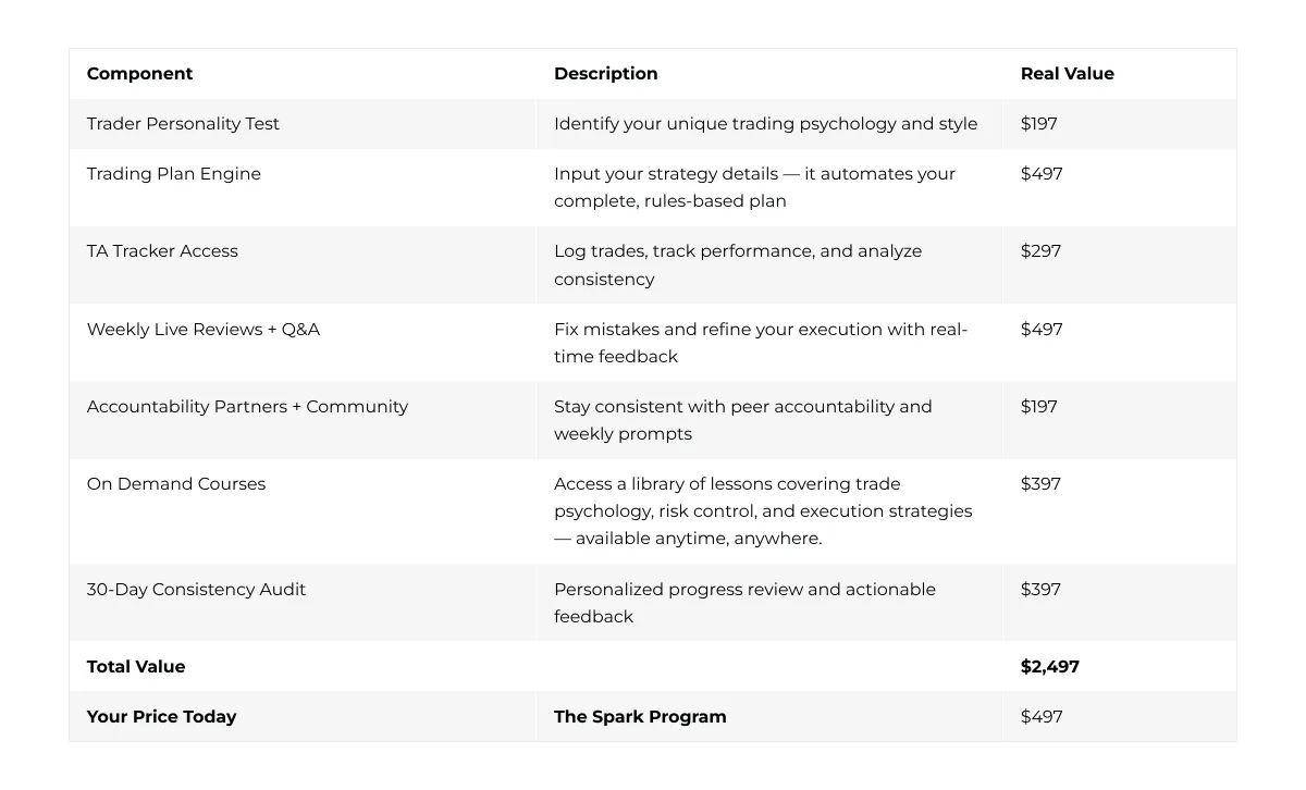 Great question. Most programs teach random strategies with no accountability. The Spark Program is built around your trader personality, a custom trade plan, and accountability milestones. This isn’t a “one-size-fits-all” approach — it’s personalized to you.